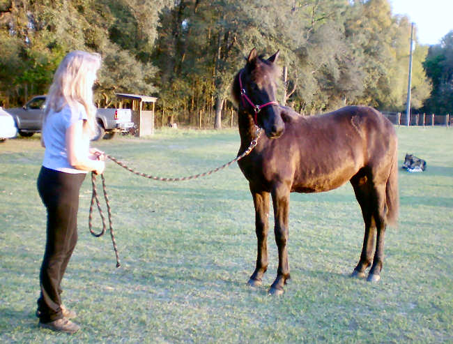 I wish I could express in words the happiness I feel with this little Filly...Here she was yesterday ( Aug 1st, 2009 ) on her first day out of the pasture being ponied by big brother Bubba. She did not spook one time as cars, tractors, motorcycles and dogs wizzed by her came at her. At one point she became bored and wanted to play...she likes to keep her mind active for sure. NOTHING phases her, NOTHING! Her mane is so think it hangs on both sides of her neck same as Bubba. Everyone thinks he is her momma. well until they check the plumbing. Thank you so much for putting out there quality Raven babies...everyday I wake up I can not wait to start working with her. She is AMAZING. And beautiful. Melody Miller and Liberty