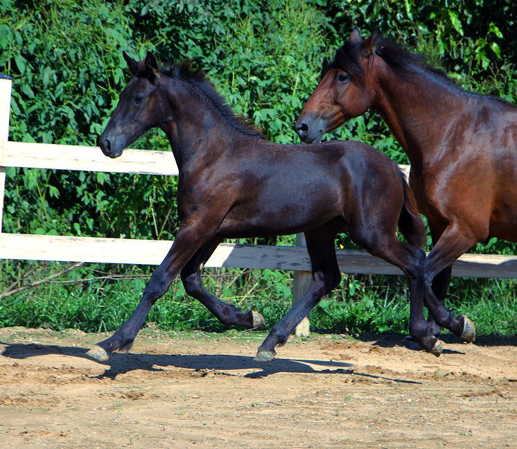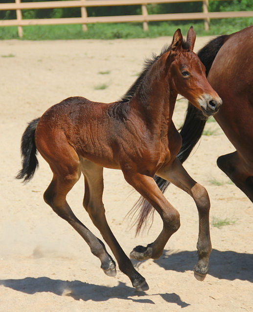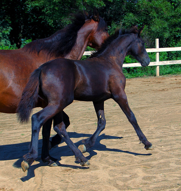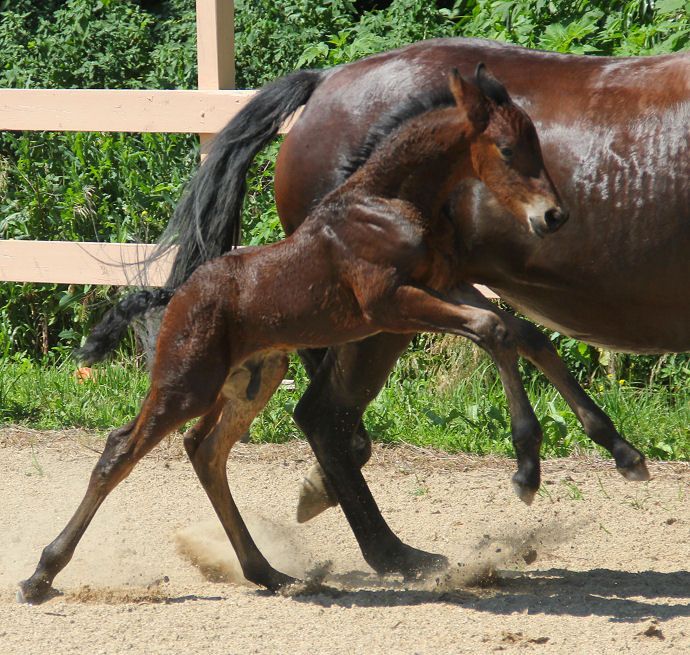 Pictures below of Jewel's filly by Evan taken June 25th, 2020, almost a month old. This filly inherited the BIG movement and BIG hair!