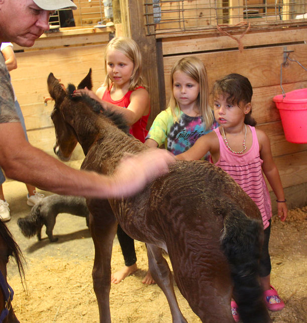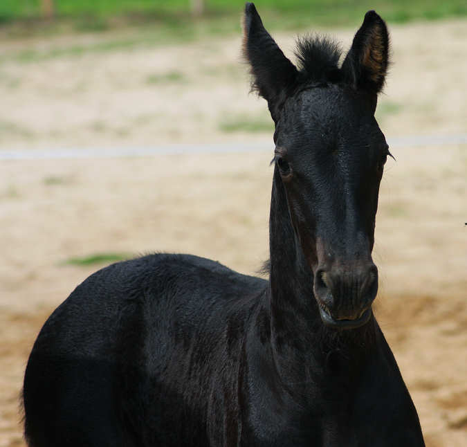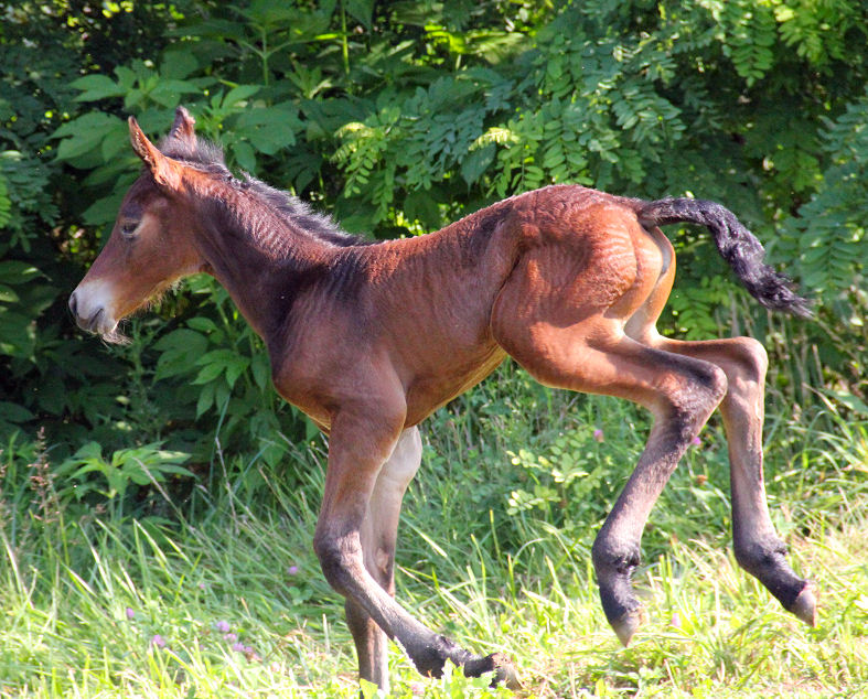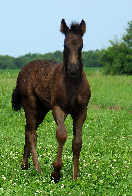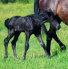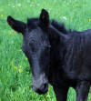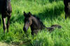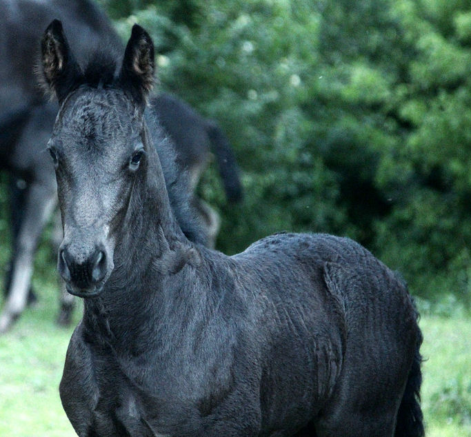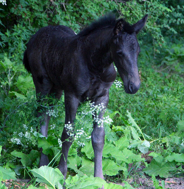 Picture June 15th, 2021 TWO weeks old. Too hot to ask them to move but he enjoyed playing in the flowers. This black colt inherited the mega hair gene from his sire.
