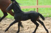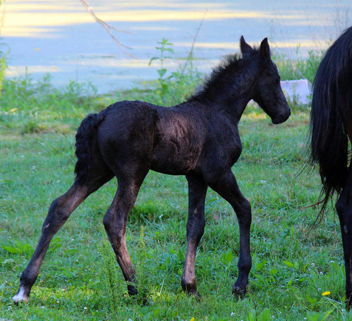 Jewel was bred to Evan and delivered an all black 75%Friesian filly June 19th, 2022 SOLD. Pictured below June 24th, 2022 5 days old.
