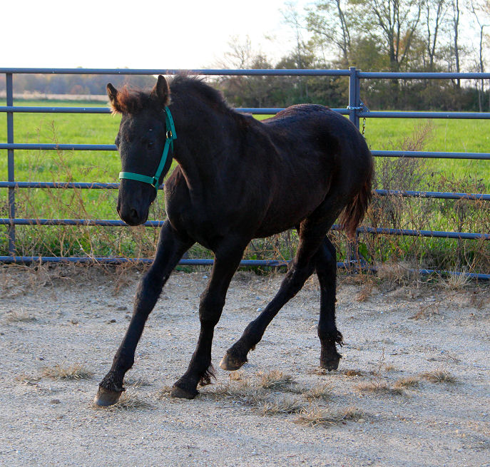 Jewel was bred to Evan and delivered a big black stud colt June 1st, 2021. This colt is registered with Friesian Heritage Horse with the name Sterling as he really is quality. Sterling is 75% Friesian, 25% Thoroughbred, will be tall and have the mega hair. He is for sale for $6000.00 SOLD! Sterling pictured below Nov 8th, 2021