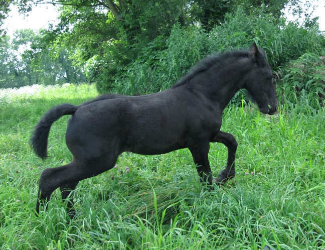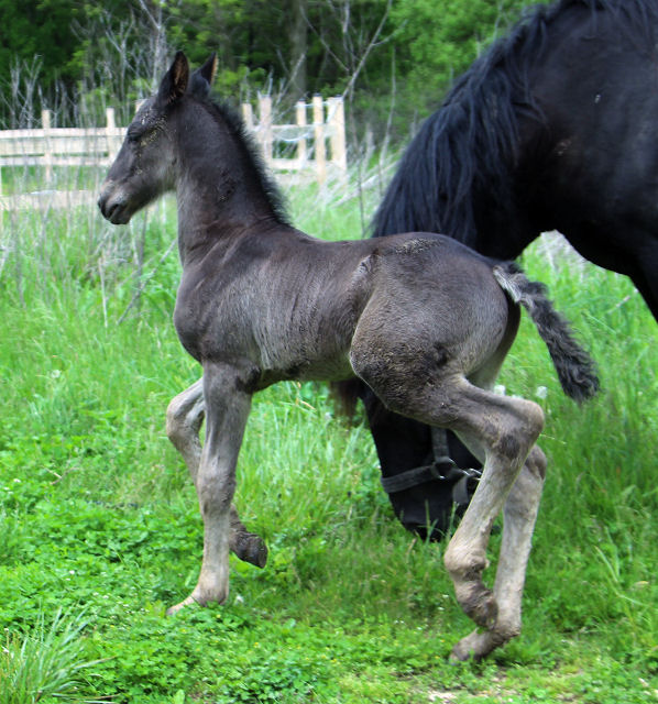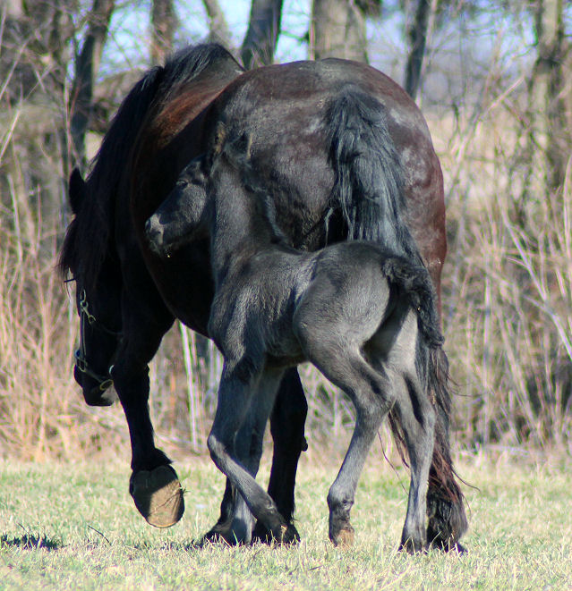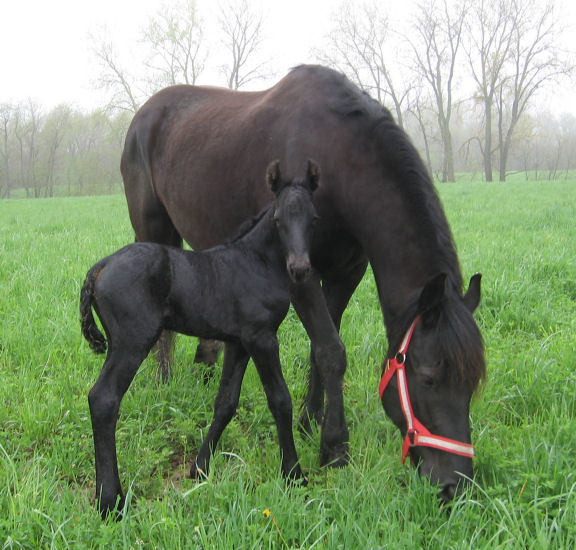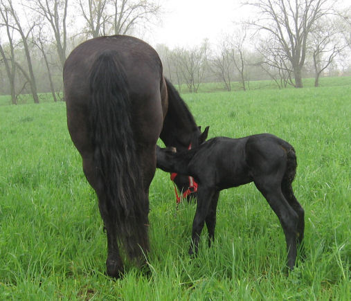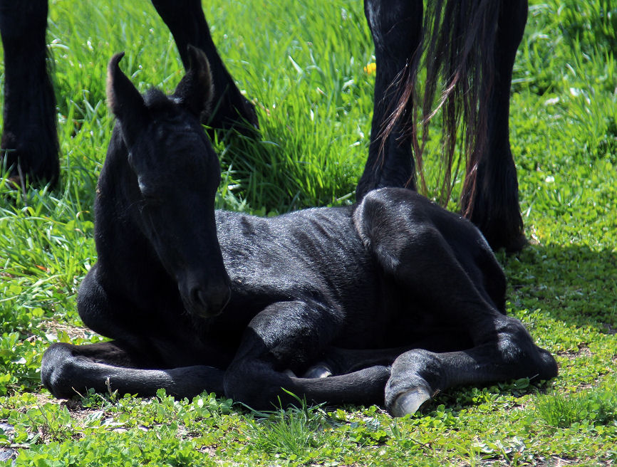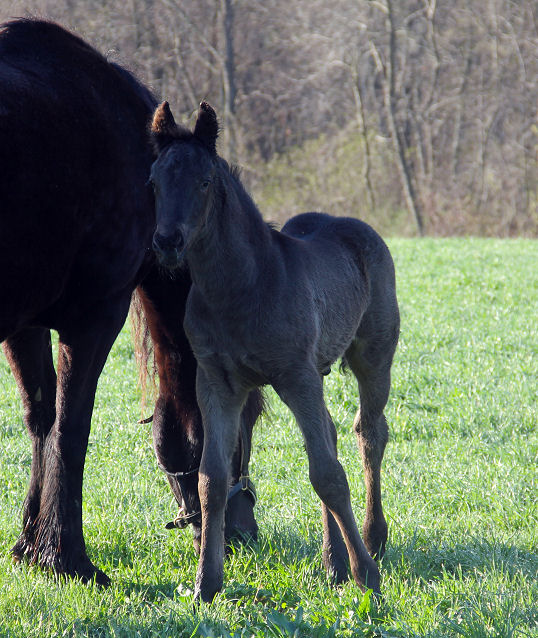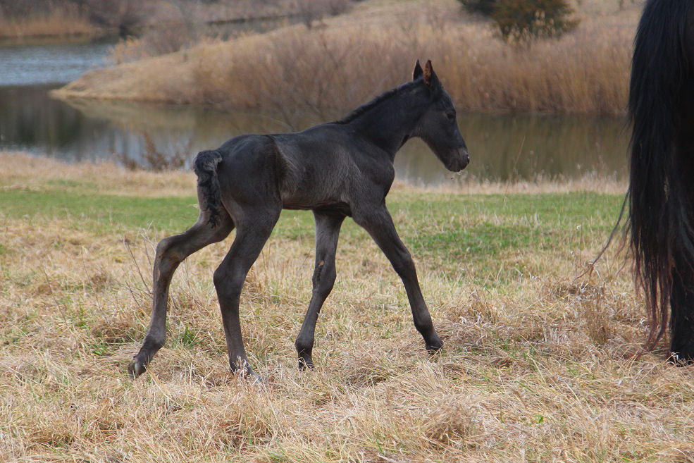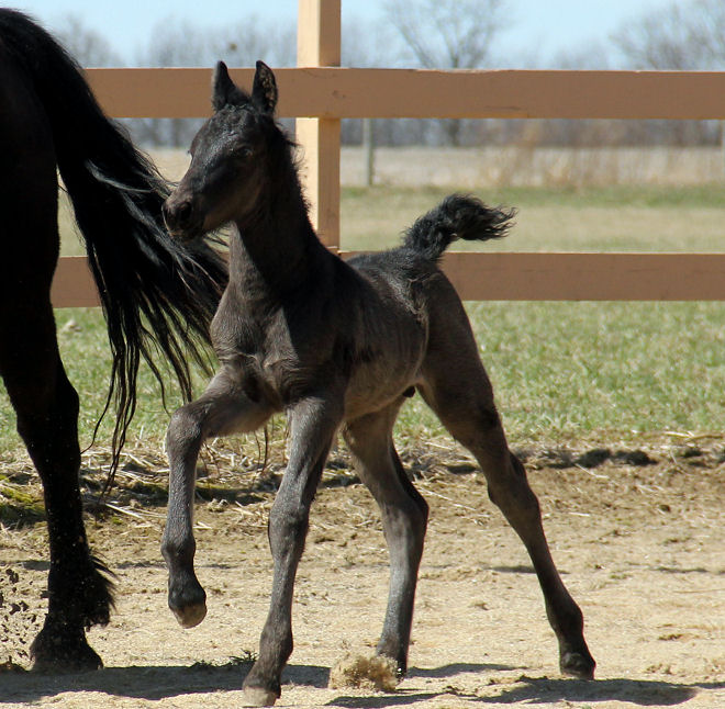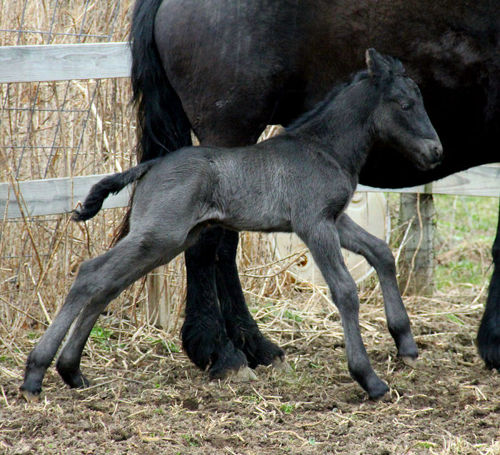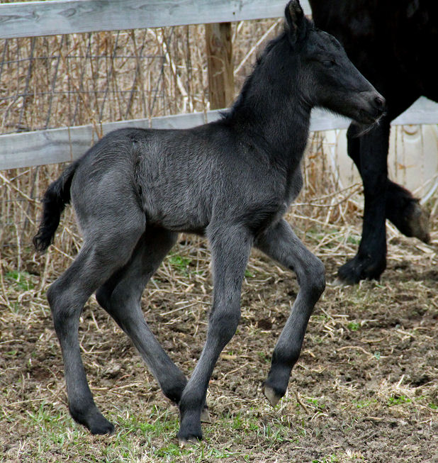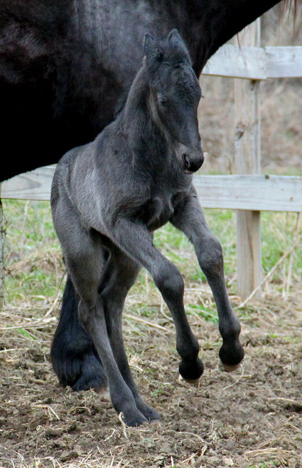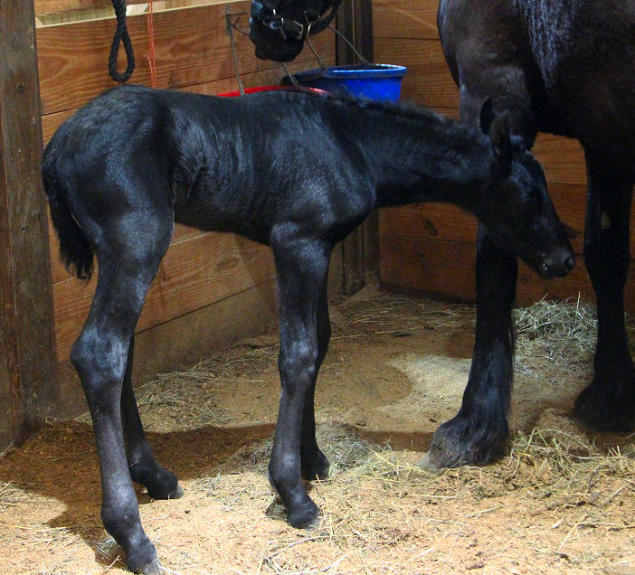 Lily delivered a gorgeous all black silver tipped very tall colt March 23rd, 2015 This colt is for sale $5000.00 SOLD! He will be tall, at least 16.3 hands, have an abundance of hair, and have amazing movement. He will be registered with Friesian Heritage Horse as soon as he is named. This colt is 75% Friesian but looks and moves like a purebred.