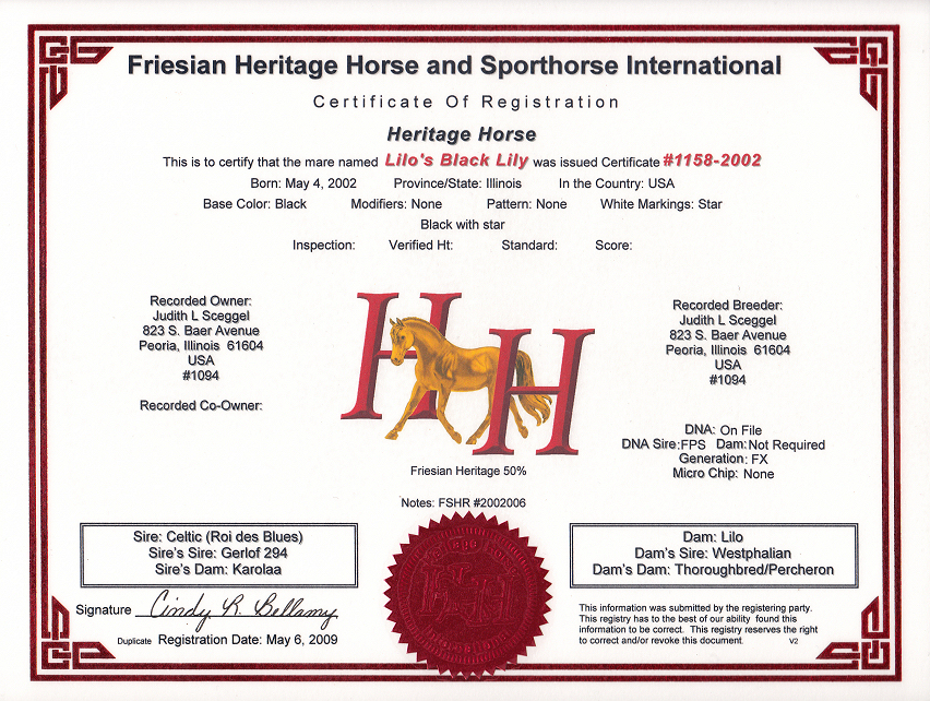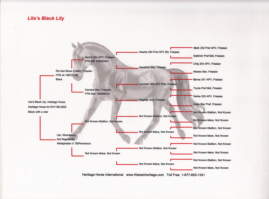 Lilo's Black Lily born May 4th, 2002 registered with Friesian Heritage Horse. Lily was born at noon with many Bridlewood kids in attendance, she is an absolute favorite with EVERYONE! Lily stands a solid 17 hands and is considered baroque. Lily was bred back to Valiant and delivered a nice strong healthy colt Feb 29th, 2024. This colt is for sale $7000.00 SOLDThis colt is 75% Friesian 25% Warmblood. He should end up 17 hands like his full siblings and Lily.