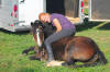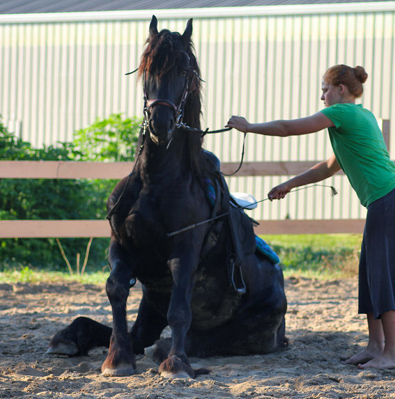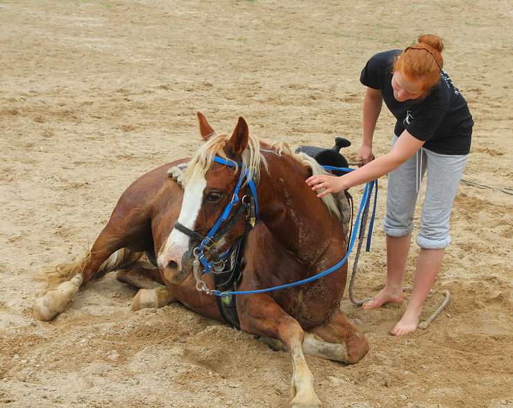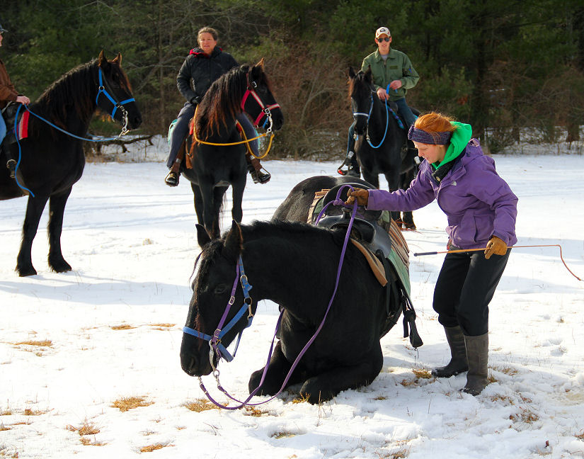 Below Emily has taken Valiant to Sandridge State Forest with a group of horses and has asked him to lay down for the mount.