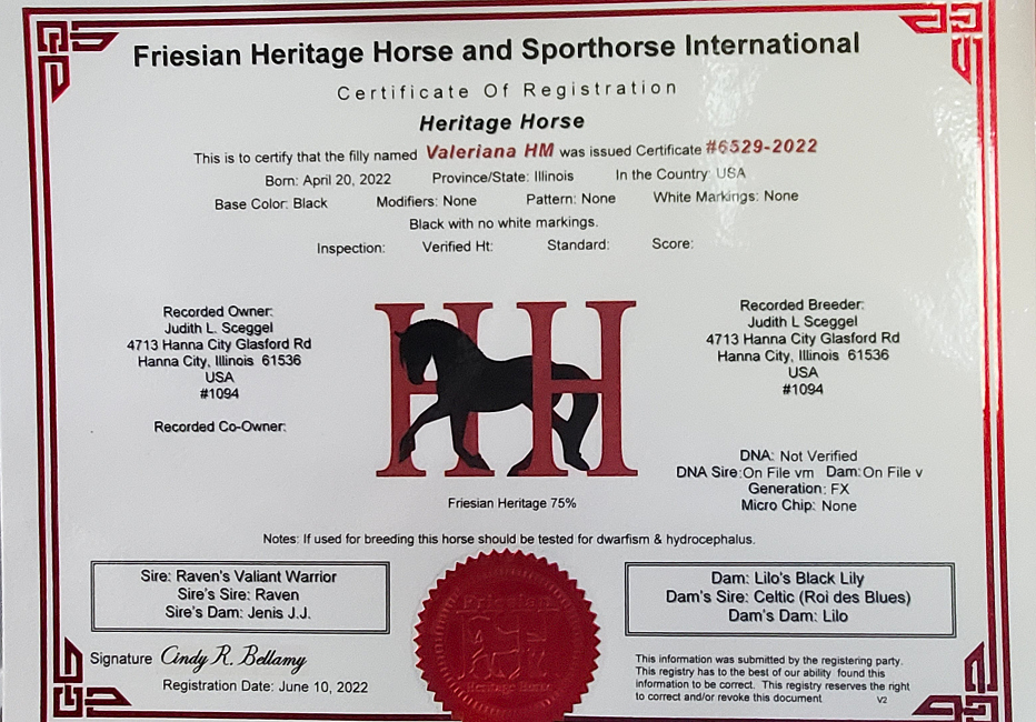 Born April 20th, 2022 out of our wonderful Lily by Valiant our Friesian stallion. She was retained and will be part of our amazing Horsemeister herd. She is registered with FHHI