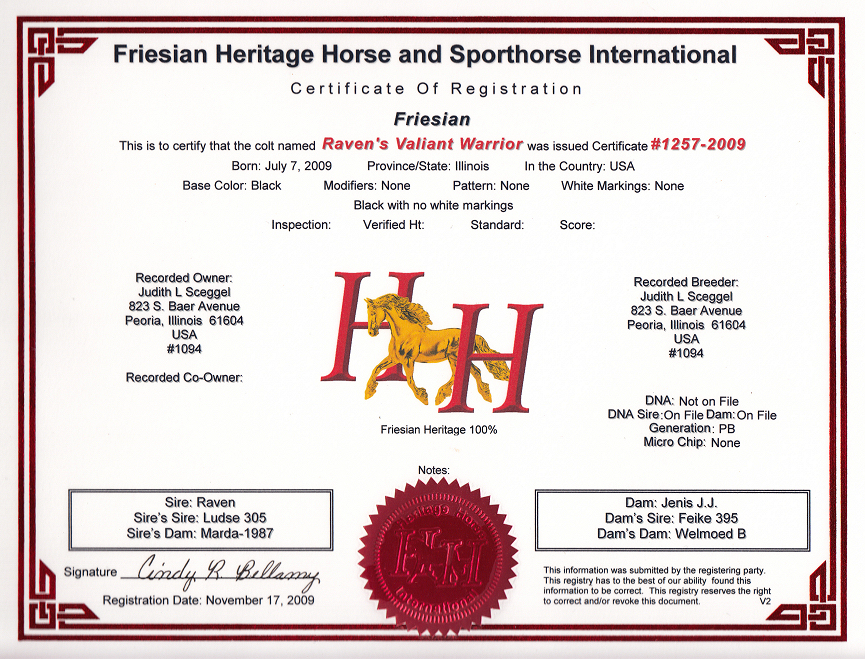 Born July 7th, 2009 registered with Friesian Heritage Horse.
