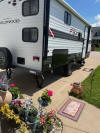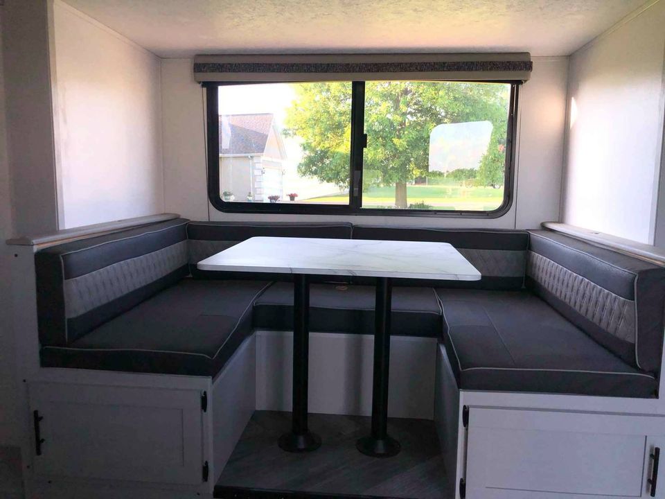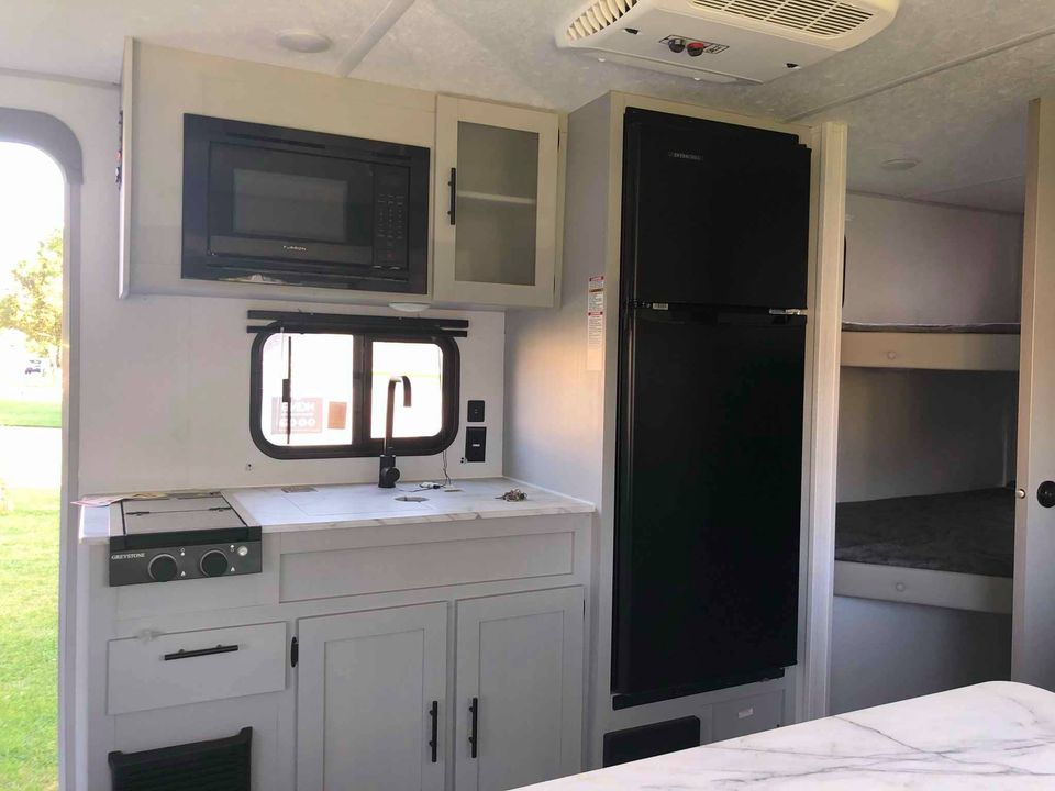 This 2021 camper is well designed for a fantastic family vacation. Sleeping 8 This trailer has all of the extras PLUS. Double bunks in the back, The dinette easily seats 6 people and a queen size bed at night, a queen sized Murphy bed that folds up into a couch during the day. Power Jack USB ports. Roof AC. Automatic awning. Huge 11 cubic foot fridge inside and mini kitchen outside, and outdoor gas griddle, Large kitchen sink with cover for plenty of counter space, two burner stove also covered. External hot and cold shower. Large storage compartment. Panorama window.